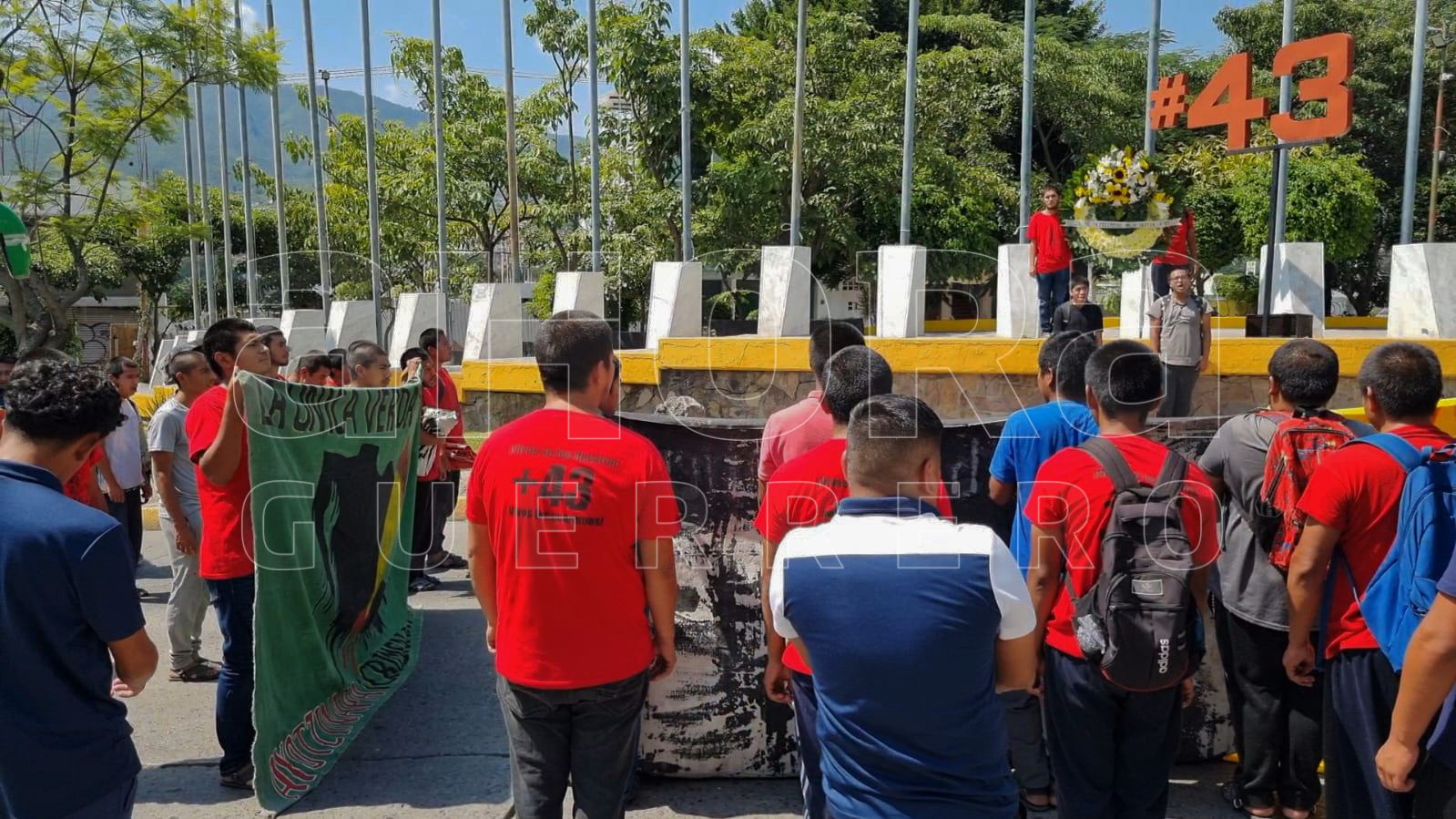 Al cumplirse 133 meses de la desaparición de 43 normalistas en la ciudad de Iguala, estudiantes de la escuela normal rural “Raúl Isidro Burgos”, junto con el colectivo de desaparecidos “Lupita Rodríguez”, realizaron una protesta en el antimonumento a los 43 en Chilpancingo.