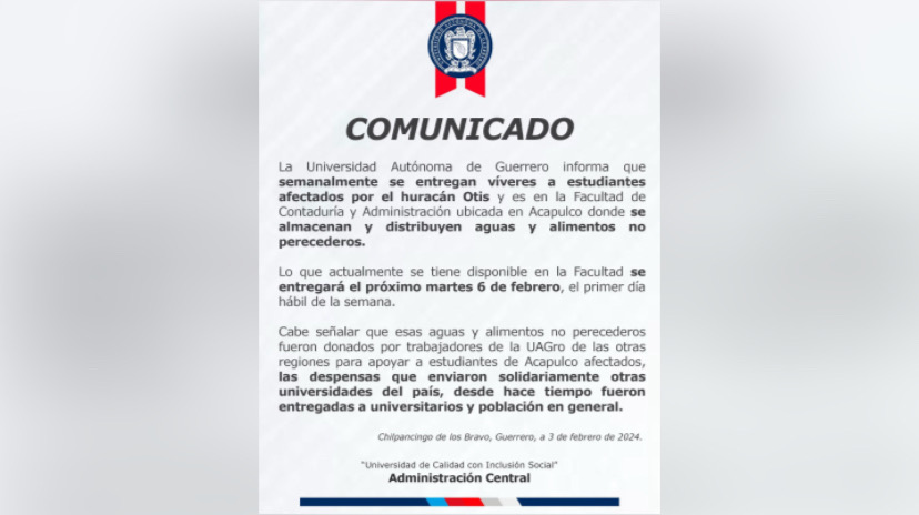 Tras la difusión de un video en el que se ven botellas de agua y alimentos no perecederos dentro de un salón de la citada facultad, que de acuerdo a la denuncia serían despensas que fueron donadas por particulares para entregar a los afectados por el huracán Otis, la UAGro desmintió el hecho.