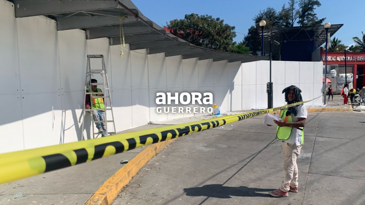 Minutos antes de las 12 del mediodía, trabajadores pintaron de blanco el mural externo de la Facultad de Derecho de la UAGro, en donde había murales significativos de la lucha social en el estado.