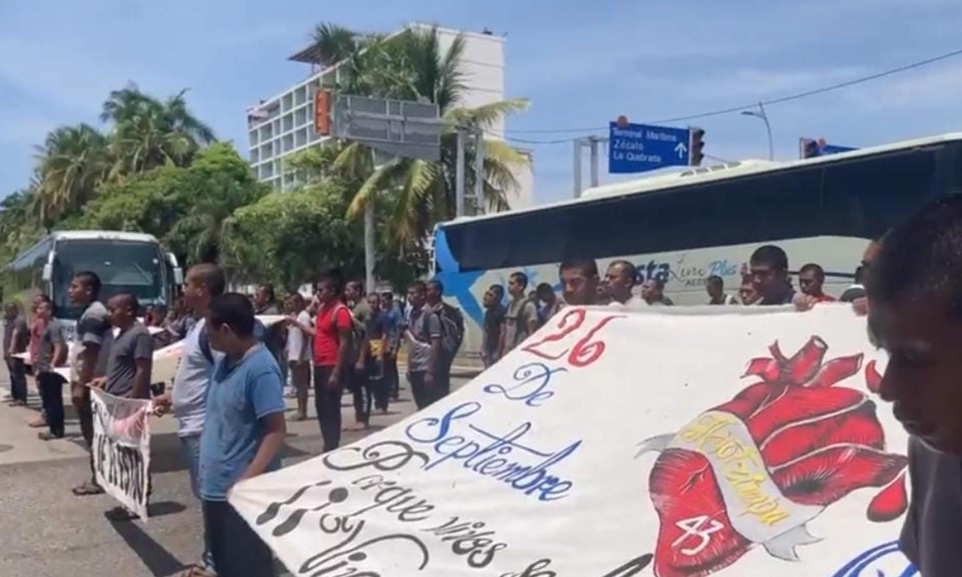 Estudiantes de la Normal de Ayotzinapa, marcharon sobre la avenida Costera de Acapulco, a casi 8 años de la desaparición de los 43 jóvenes desaparecidos en los trágicos hechos del 26 y 27 de septiembre de 2014, en Iguala, Guerrero.