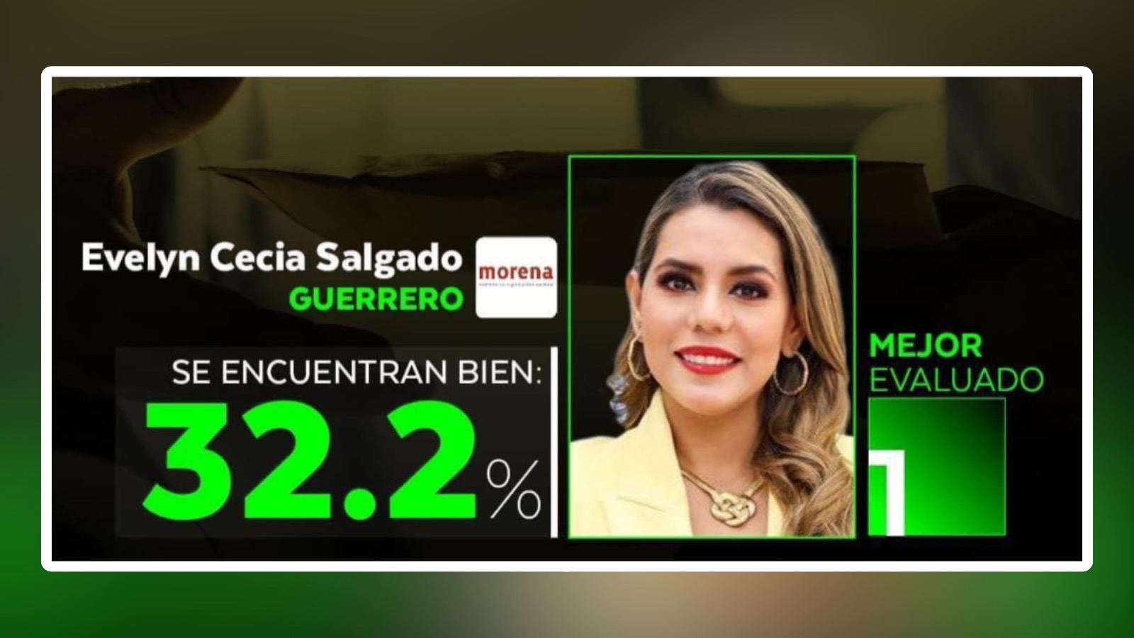 La mandataria guerrerense, Evelyn Salgado Pineda es considerada como la gobernadora que mejor ha trabajado en el combate a la corrupción, ubicándola en el primer lugar de entre todos sus homólogos, en una encuesta realizada por la consultora Arias en la última semana de enero.
