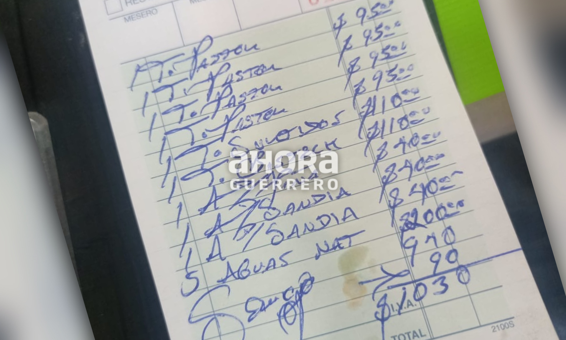 En la nota se detalla que los clientes consumieron 4 órdenes de tacos al pastor, con un valor de 95$ la orden; 1 orden surtida y 1 más de bistec, con un valor de 110 pesos cada una; 3 aguas de sandía, con valor de 40 pesos y 5 aguas naturales, del mismo valor.