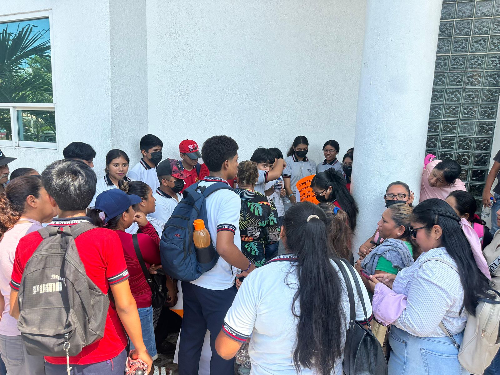 Acapulco, Gro., 16 de abril de 2026.- Maestros, alumnos y padres de familia de la Preparatoria Popular ubicada en la colonia Fuerza Aérea realizaron una protesta pacífica en el Palacio Federal para exigir la adquisición de un terreno donde pueda operar el plantel.