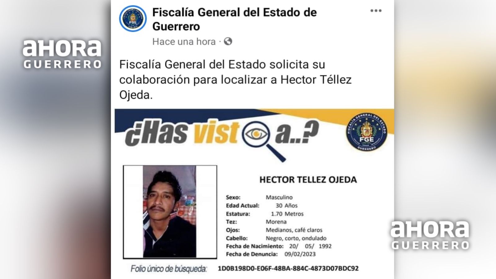 A pesar de ese hecho, este día las autoridades la FGE nuevamente publicaron la ficha de Héctor Téllez y pidieron colaboración de la ciudadanía para su localización.