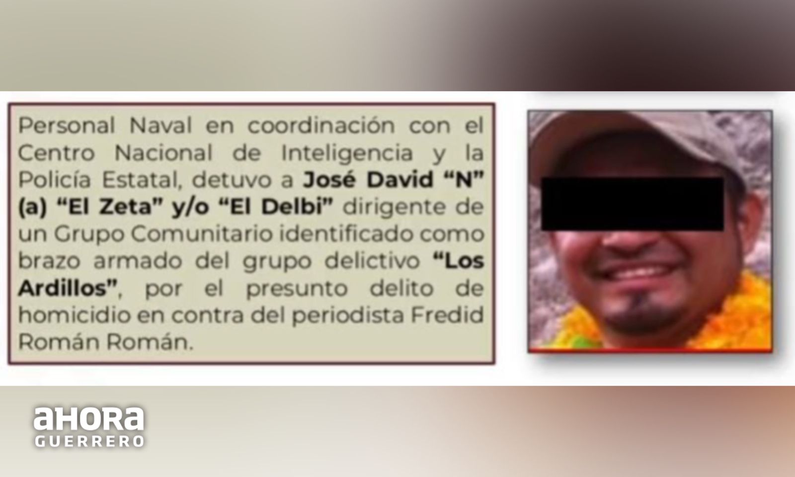 “Personal Naval en coordinación con el Centro Nacional de Inteligencia y la Policía Estatal, detuvo a José David “N” “El Zeta” y/o “El Deibi” dirigente de un Grupo Comunitario identificado como brazo armado del grupo delictivo Los Ardillos, por el presunto delito de homicidio em contra del periodista Fredid Román Román”, se lee en la ficha.