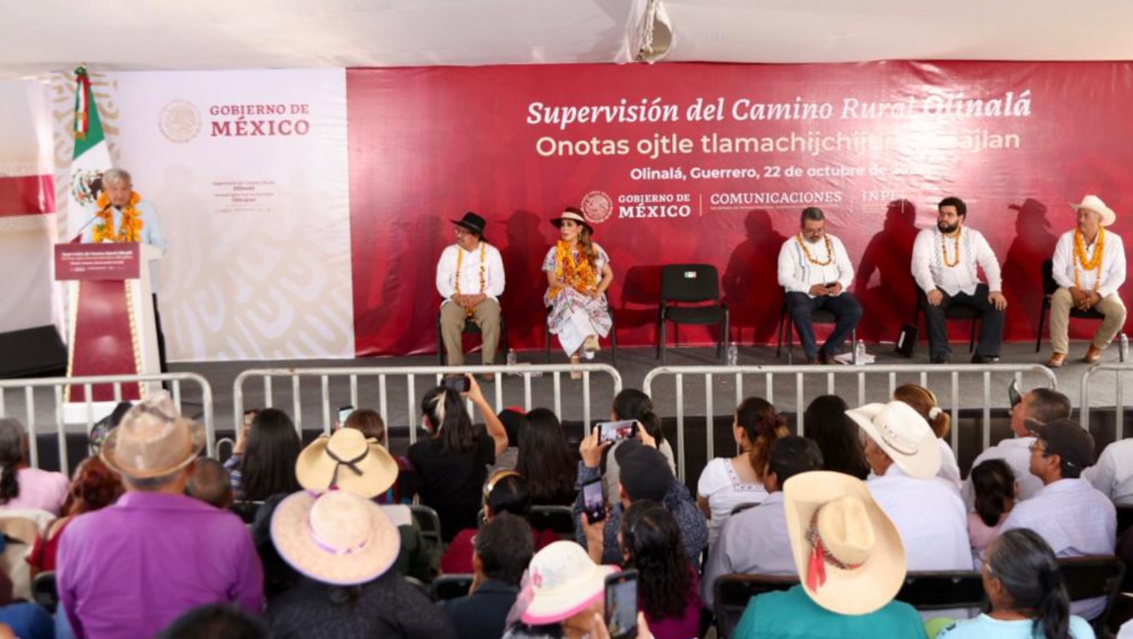 El presidente Andrés Manuel López Obrador y la gobernadora Evelyn Salgado Pineda, recibieron las muestras de cariño de los pobladores nahuas de Olinalá, en la región de la Montaña, quienes, con cadenas de flores, pancartas, vivas, porras y música de viento, que caracteriza la costumbre de los pueblos al mostrar su alegría por la visita de los ejecutivos federal y estatal quienes evaluaron los avances de las obras de pavimentación de caminos rurales artesanales.