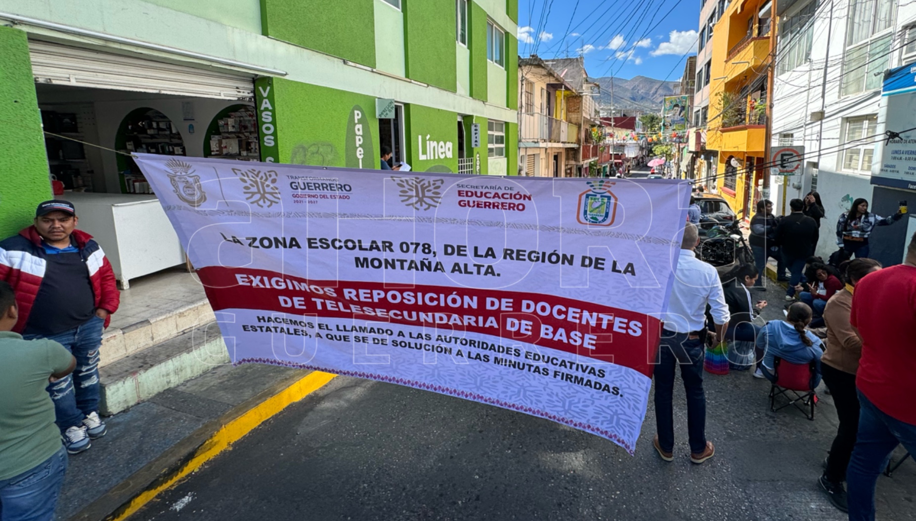 Maestros de la zona escolar 078 de telesecundaria, ubicada en la región Montaña Alta, bloquearon este día la céntrica calle Pedro Asensio de Alquisras, frente a la Dirección General de Secundarias de la SEG; demandan la reposición de 10 docentes.