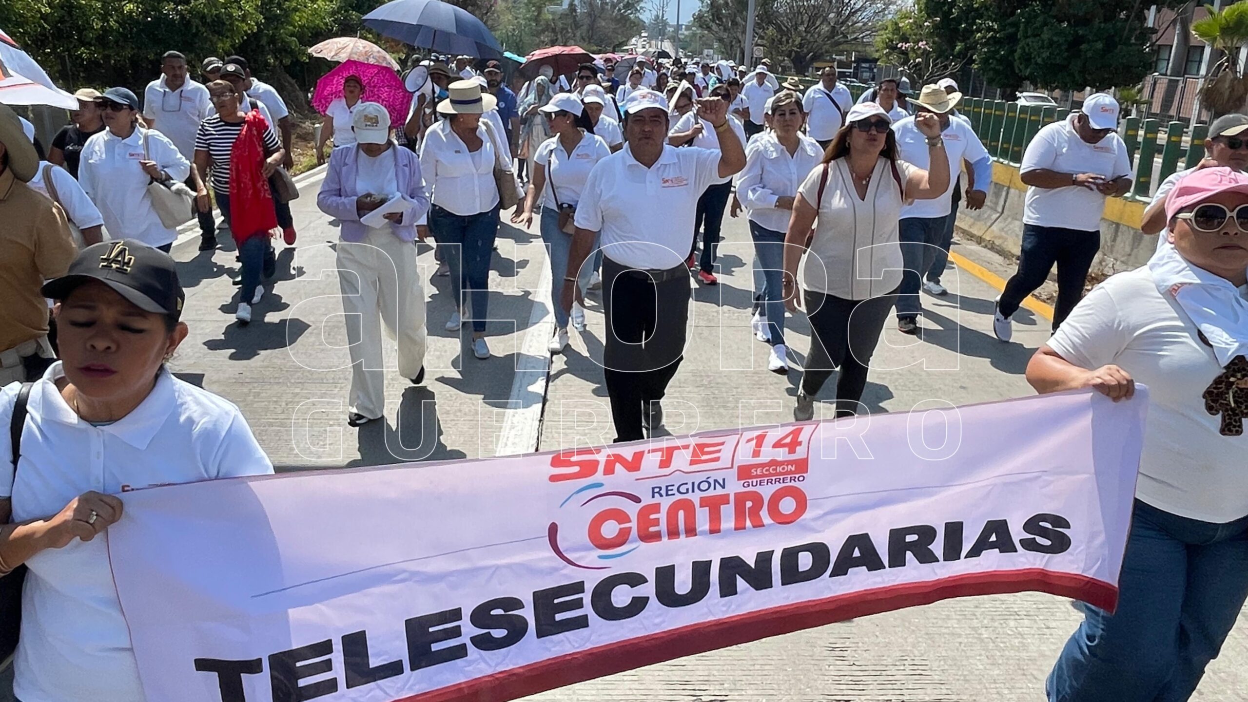 Más de 500 integrantes del Sindicato Nacional de Trabajadores de la Educación (SNTE), sección XIV, marcharon este día por uno de los carriles de alta velocidad del bulevar Vicente Guerrero, que conecta con la Autopista del Sol en Chilpancingo; demandan el pago de diversos adeudos.