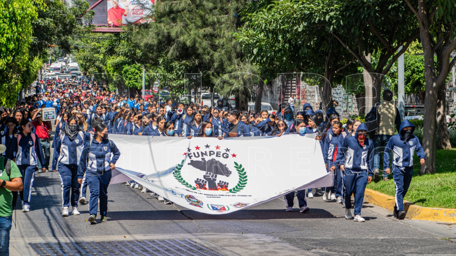 Más de 600 normalistas, adheridos al Frente Unido de Normales Públicas del Estado de Guerrero (FUNPEG), protestan en las principales avenidas de Chilpancingo, para exigir atención a su pliego de demandas.