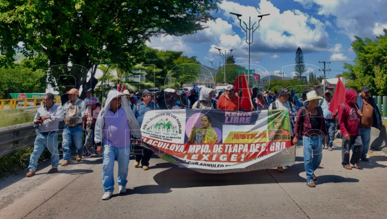 Como parte de las acciones simultáneas en nueve estados, para pedir la liberación de presos políticos y el retorno seguro de comunidades desplazadas, integrantes del Frente Popular de la Montaña, marcharon este día por el bulevar Vicente Guerrero.