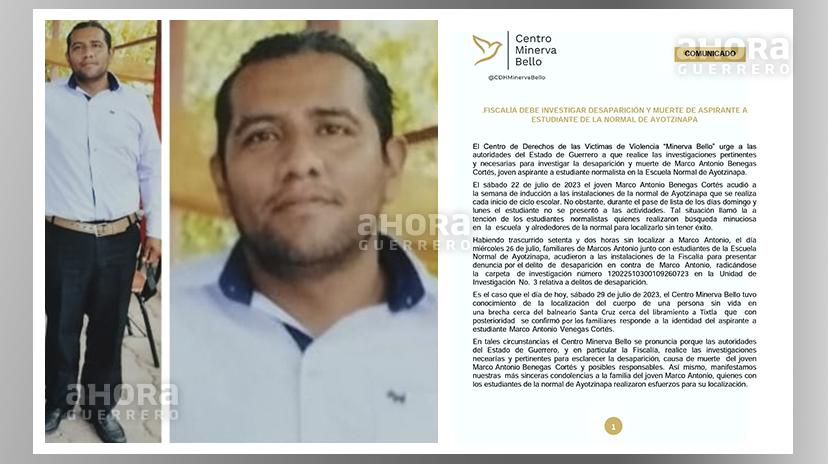 “Es el caso que el día de hoy, sábado 29 de julio de 2023, el Centro Minerva Bello tuvo conocimiento de la localización del cuerpo de una persona sin vida en una brecha cerca del balneario Santa Cruz cerca del libramiento a Tixtla que con posterioridad se confirmó por los familiares responde a la identidad del aspirante a estudiante Marco Antonio Venegas Cortés”.
