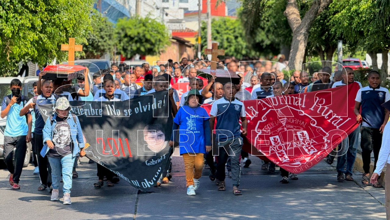 Con consignas de protesta, pintas en tiendas Oxxo, bardas, parques públicos y oficinas gubernamentales, los manifestantes recriminaron la falta de acceso a la justicia para los normalistas asesinados; al frente de la movilización cargaron dos ataúdes con cruces simbólicos, en memoria de sus compañeros caídos.