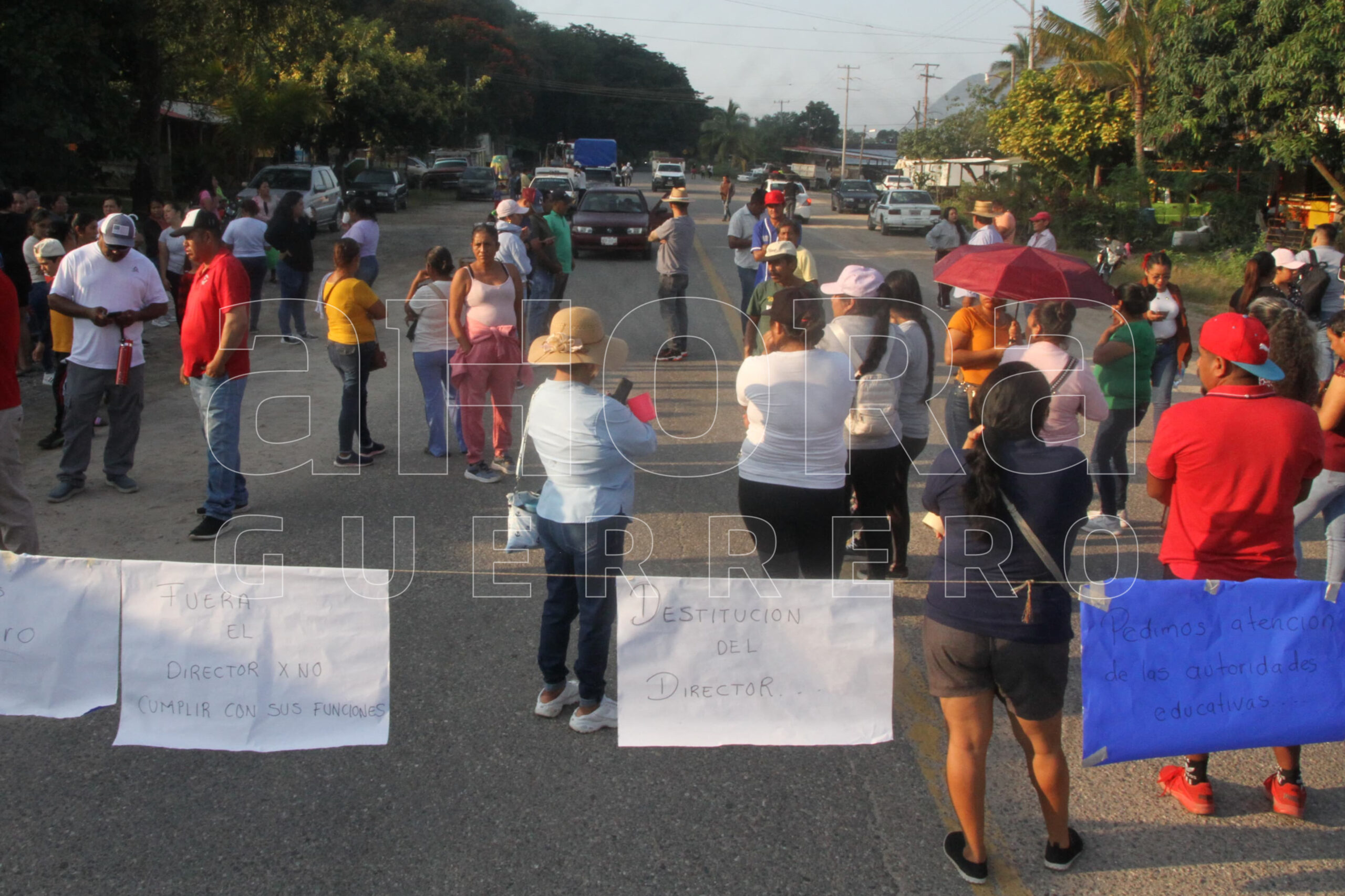 Pobladores y padres de familia de familia de la escuela primaria Benito Juárez, en Buenavista de la Salud, municipio de Chilpancingo, bloquean la carretera federal México-Acapulco, para demandar un maestro para cuarto grado.