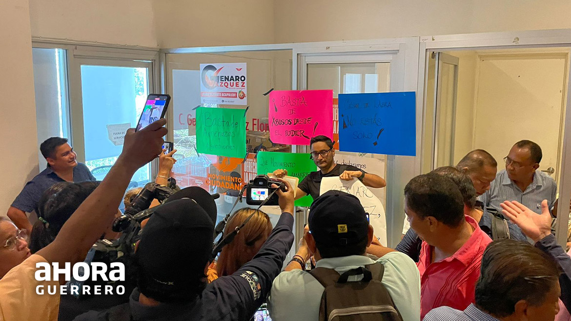 Con consignas y gritos, los periodistas ingresaron a la sala de los regidores, donde pegaron las cartulinas en el cubículo del regidor, Genaro Vázquez, quien no se encontraba en su oficina.