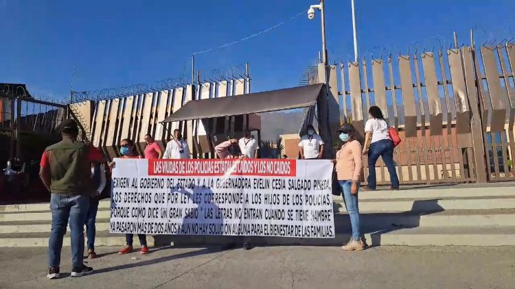 Viudas de policías estatales caídos en desempeño, así como familiares de agentes lesionados que quedaron imposibilitados para trabajar, protestaron afuera del Palacio de Gobierno en Chilpancingo, en exigencia del pago de seguros y beneficios para los familiares de los policías.