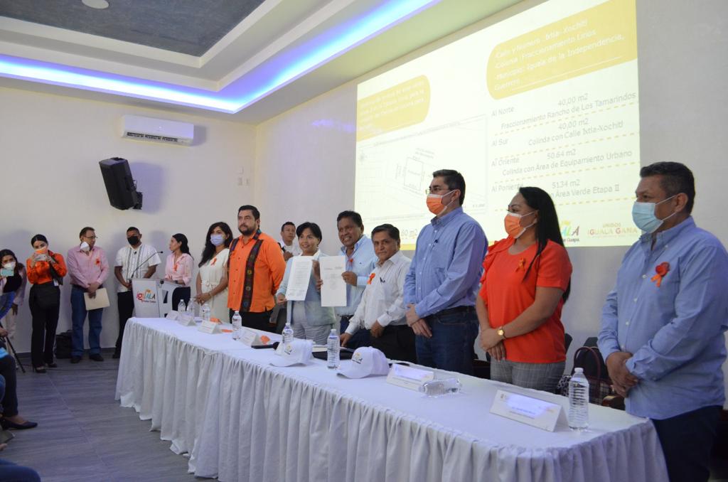 Iguala, Gro., 25 de mayo de 2022.- En el marco del Día Naranja que se conmemora cada veinticinco de cada de mes, la Directora Estatal para Prevenir la Violencia contra la Mujer, Yenedith Barrientos Santiago, en representación del secretario general de Gobierno, Ludwig Marcial Reynoso Núñez, asistió a la firma del contrato de donación de un bien inmueble, por parte de la administración municipal que encabeza David Gama Pérez, para la construcción del Centro de Justicia para la Mujer.