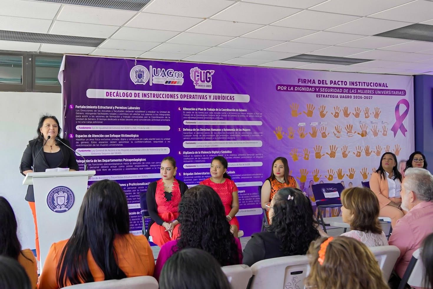 Durante el acto también se presentó el Decálogo de Instrucciones Operativas y Jurídicas, un documento que establece lineamientos para mejorar la atención, la prevención y la protección de los derechos humanos de las mujeres en los espacios universitarios.